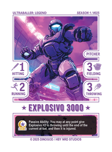 “Cosmic Club engineers created the Explosivo 3000 for advanced batting practice, but it was so entertaining in the laboratory environment they turned it into a very popular bot Ultraballer.”